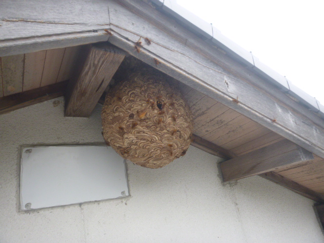 本日は大屋根の軒下に50センチくらいの大きなキイロスズメバチ駆除に向かいました! 見るからに働きバチが巣の表面にたくさんいる状況で、、、 何とか刺されることなく駆除を完了いたしましたが、キイロスズメバチの攻撃性は半端ないです!!